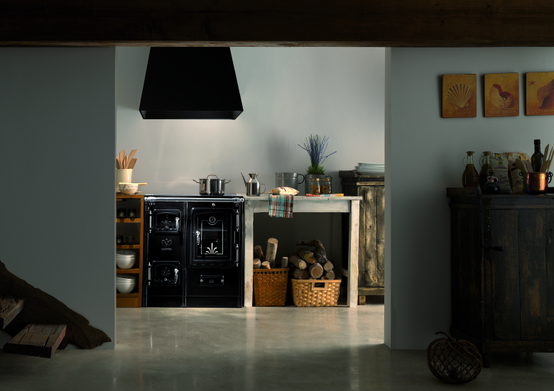 Vedeldad köksspis med yta i högkvalitativ emalj. Kan rengöras med bara en fuktig trasa.