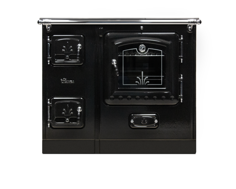 Vedeldad köksspis med yta i högkvalitativ emalj. Kan rengöras med bara en fuktig trasa.