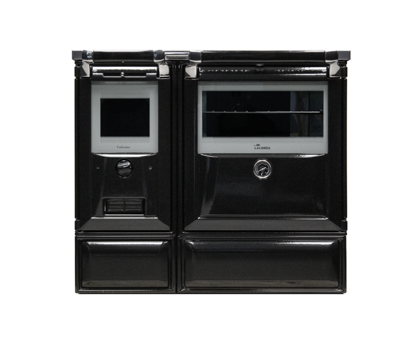 Vedeldad köksspis med yta i högkvalitativ emalj. Kan rengöras med bara en fuktig trasa.
